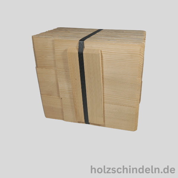 Holzschindeln sind ein Naturprodukt – trocken lagern und vor anhaltender Feuchtigkeit schützen. Beim Bearbeiten bitte geeignete Schutzkleidung tragen. Entsorgung gemäß den örtlichen Vorschriften.